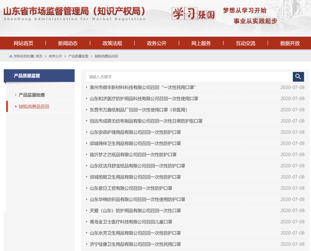 近日,山东省市场监管局官网发布多则口罩召回信息,共涉及26家企业,详情如下: